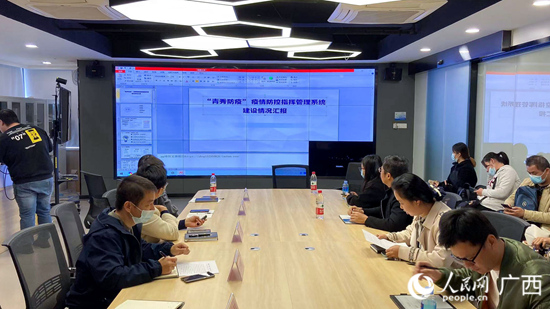 工作人員向媒體記者講解青秀區(qū)疫情防控綜合管理平臺(tái)。人民網(wǎng) 王功孝攝