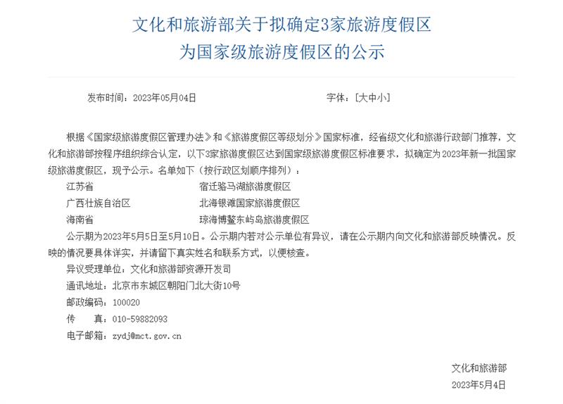 據(jù)文旅部消息,根據(jù)《國家級旅游度假區(qū)管理辦法》和《旅游度假區(qū)等級劃分》國家標(biāo)準(zhǔn),經(jīng)省級文化和旅游行政部門推薦,文化和旅游部按程序組織綜合認定,以下3家旅游度假區(qū)達到國家級旅游度假區(qū)標(biāo)準(zhǔn)要求,擬確定為2023年新一批國家級旅游度假區(qū),現(xiàn)予公示。名單如下(按行政區(qū)劃順序排列):