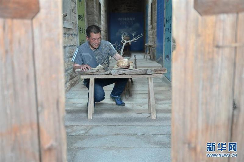 4月19日,蔡競(jìng)翔在被改造為海漂藝術(shù)品陳列館的老宅里用船木、貝殼和珊瑚骨進(jìn)行創(chuàng)...