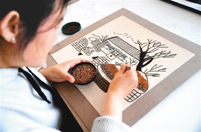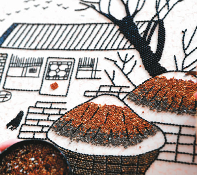 師獻(xiàn)巧在工作室中制作糧食畫。 |