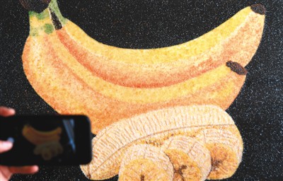 一名前來參觀的游客在拍攝糧食畫作品。 |