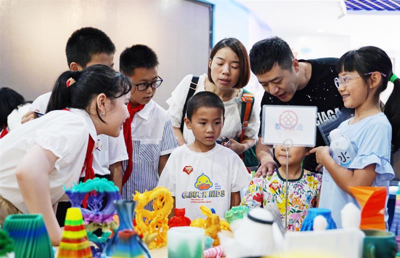 成都七中初中附屬小學(xué)一年級新生在學(xué)校人工智能館觀看3D打印機打印的作品。新華社記者邢拓 攝