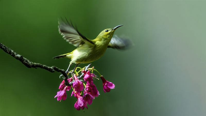 2月27日,福州市區(qū)街頭綻放的花朵吸引了成群的鳥兒,圖為一只繡眼鳥在枝頭嬉戲。新華社記者 梅永存 攝