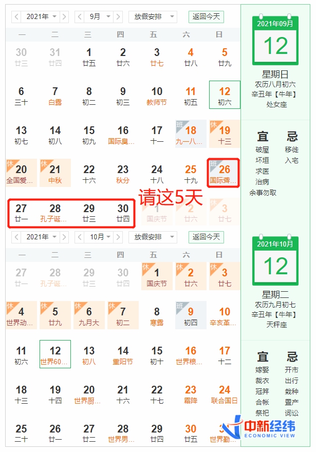 今年中秋假期的放假時(shí)間為9月19日至21日,9月18日(星期六)則要上班。3天時(shí)間適合短途旅行,如果在9月18日、9月22日至24日、9月26日(星期日上班)這5天請(qǐng)假,加上9月25日(星期六),就能拼出一個(gè)長達(dá)9天的假期。