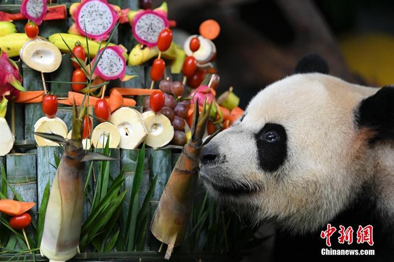 7月29日,在位于廣東省廣州市的長隆野生動物世界內(nèi),三胞胎之一的大熊貓“帥帥”品嘗特制生日蛋糕。當(dāng)日,全球唯一大熊貓三胞胎“萌、帥、酷”迎來6歲生日。