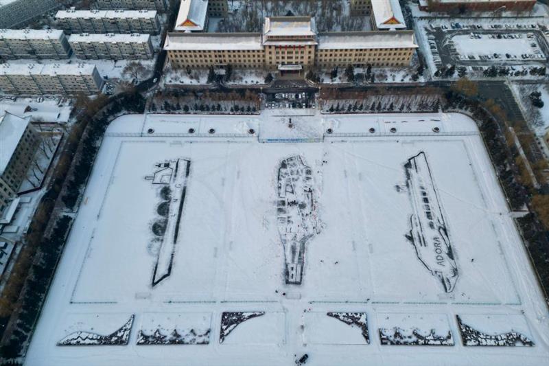 ??在我國最北省會城市哈爾濱,哈爾濱工程大學(xué)近千名師生在元旦前一天歷時5個小時,在學(xué)校操場上用皚皚白雪打造出“福建艦”航空母艦、“愛達(dá)·魔都號”郵輪、“大鵬昊”運(yùn)輸船。