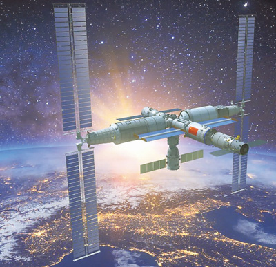 中國空間站在軌運行示意圖?!≈袊教炜萍技瘓F(tuán)五院供圖