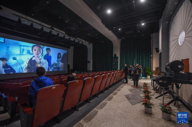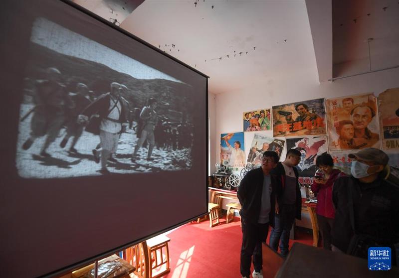 11月20日,在杭州市余杭區(qū)瓶窯鎮(zhèn)的老街電影博物館內(nèi),游客在觀看老式電影放映機放映的老電影。新華社記者 徐昱 攝