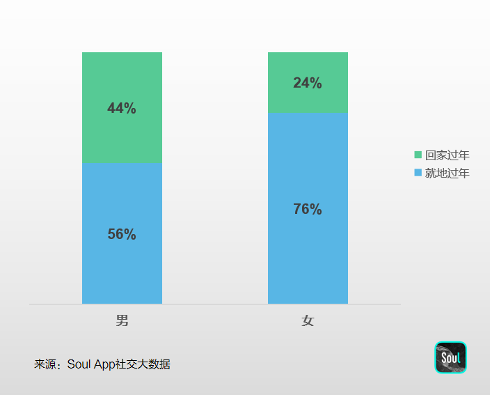 據(jù)鐵路部門、人力資源和社會(huì)保障部等多部門統(tǒng)計(jì),今年全國有超過1億人就地過年。Soul社交大數(shù)據(jù)顯示,春節(jié)7天假期中留在原地過年的用戶占比高達(dá)69%,其中22-25歲的職場新人占比達(dá)5成,其次是27-30歲年齡段用戶,占比近3成。在男女比例方面,女性用戶比男性更愿意嘗試新過年方式,就地過年的人數(shù)比例高出20%。