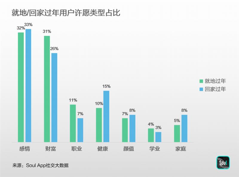 在Soul,數(shù)以十萬計(jì)用戶在廣場上許下了自己的新年愿望。總體來看,“脫單”“桃花運(yùn)”等情感類愿望最受歡迎,受疫情影響,相對(duì)于去年同期,包含“身體健康”愿望的內(nèi)容大幅增長超過80%。
