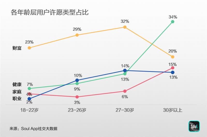 不同人群之間的愿望也出現(xiàn)了顯著差異。相比回家過年用戶,就地過年的年輕人更希望在事業(yè)和財(cái)富上有所收獲,“升職加薪”是他們對(duì)新一年的期盼;隨著女性經(jīng)濟(jì)地位的不斷提高,女性用戶也比男性更重視實(shí)現(xiàn)財(cái)務(wù)自由,財(cái)富類愿望在所有女性許愿內(nèi)容中占比超過3成,比例遠(yuǎn)高于男性;伴隨年齡增長,人們在新年愿望中對(duì)健康的重視程度也漸次提升,相比之下,對(duì)財(cái)富的渴望則在27-30歲之間達(dá)到峰值,隨后逐步下降。