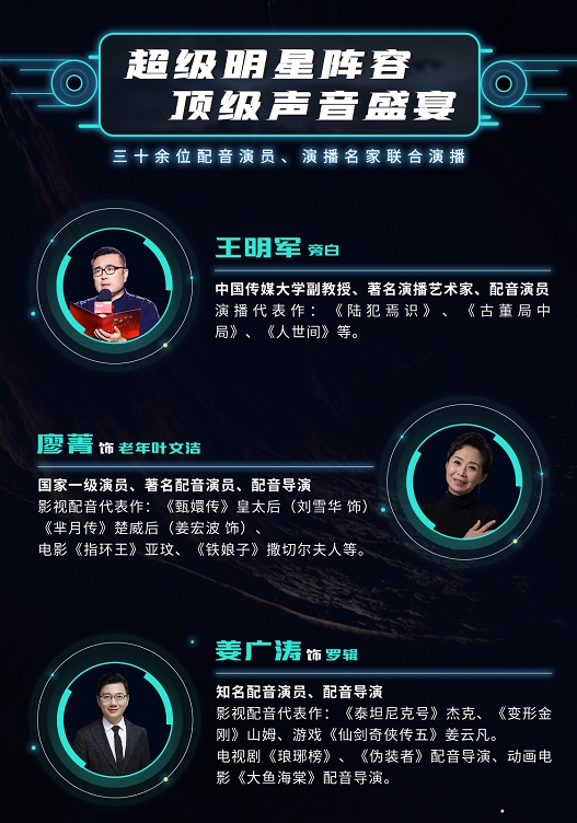 “給歲月以文明,而不是給文明以歲月”。近日,由讀客文化出品,王明軍、廖青、艾寶良、彭堯、姜廣濤、寶木中陽(yáng)等30余位央廣演播名家聯(lián)合演播的《三體》科幻有聲劇重磅上線懶人聽(tīng)書(shū),引發(fā)三體世界聲音盛宴。