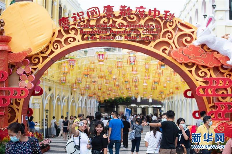 10月1日,人們?cè)诎拈T大三巴牌坊前游覽。新華社記者 張金加 攝