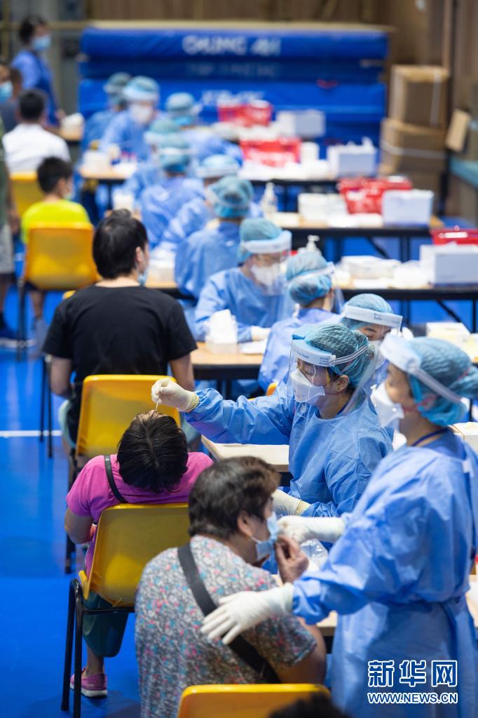 8月4日,醫(yī)護人員在澳門利瑪竇中學全民核酸檢測站為市民采樣。新華社記者 張金加 攝