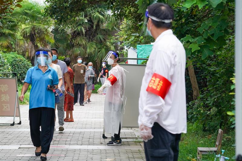 8月17日,市民在揚州市梅嶺街道鴻福二村核酸采樣點排隊,準備進行核酸檢測取樣。新華社記者 李博 攝