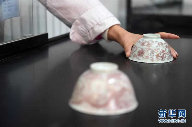 12月24日,在圓明園管理處考古工作站,工作人員對(duì)一件出土瓷器進(jìn)行補(bǔ)配。