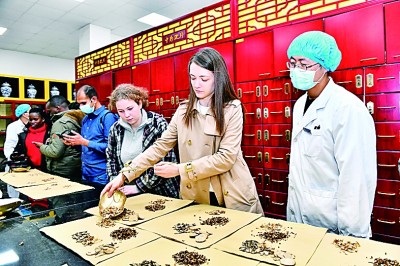 在青島中醫(yī)醫(yī)院國際學(xué)生中醫(yī)藥文化體驗(yàn)基地,留學(xué)生在藥房醫(yī)師的指導(dǎo)下對(duì)藥材進(jìn)行稱重。新華社發(fā)