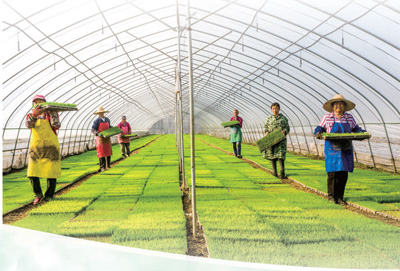 安徽肥東縣牌坊鄉(xiāng)禾豐農(nóng)機合作社社員們在工廠化育秧大棚里培育、搬運水稻秧苗。 |