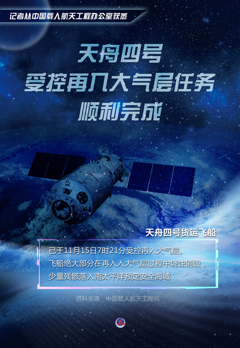 記者從中國載人航天工程辦公室獲悉,天舟四號貨運飛船已于11月15日7時21分受控再入大氣層。飛船絕大部分在再入大氣層過程中燒蝕銷毀,少量殘骸落入南太平洋預定安全海域。 新華社發(fā) 秦迎 編制