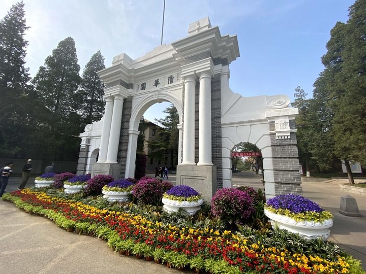 110周年校慶之際,清華大學(xué)標(biāo)志性建筑二校門前花團(tuán)錦簇。新華每日電訊記者 魏夢(mèng)佳 攝
