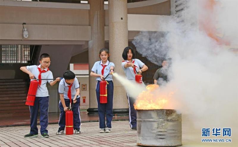 5月11日,在廈門(mén)大學(xué)附屬科技中學(xué)思明校區(qū),學(xué)生在消防員的指導(dǎo)下體驗(yàn)水槍出水“滅火”。