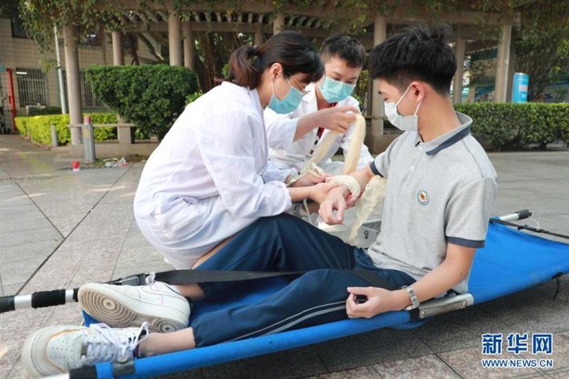 5月11日,在廈門(mén)大學(xué)附屬科技中學(xué)思明校區(qū),學(xué)校醫(yī)務(wù)人員在應(yīng)急救援演練中為一名“傷員”包扎傷口。