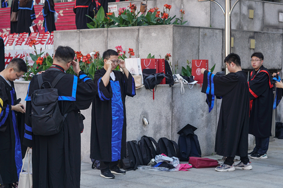 7月4日早,中國人民大學(xué)校內(nèi),返校的2020屆畢業(yè)生在室外領(lǐng)取學(xué)位服并當(dāng)場試換。