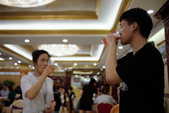 7月4日,中國人民大學(xué)校內(nèi),2020屆哲學(xué)院畢業(yè)生李弗(右)與他的班主任舉杯慶祝。去年畢業(yè)后,他繼續(xù)留在學(xué)校就讀碩士研究生。