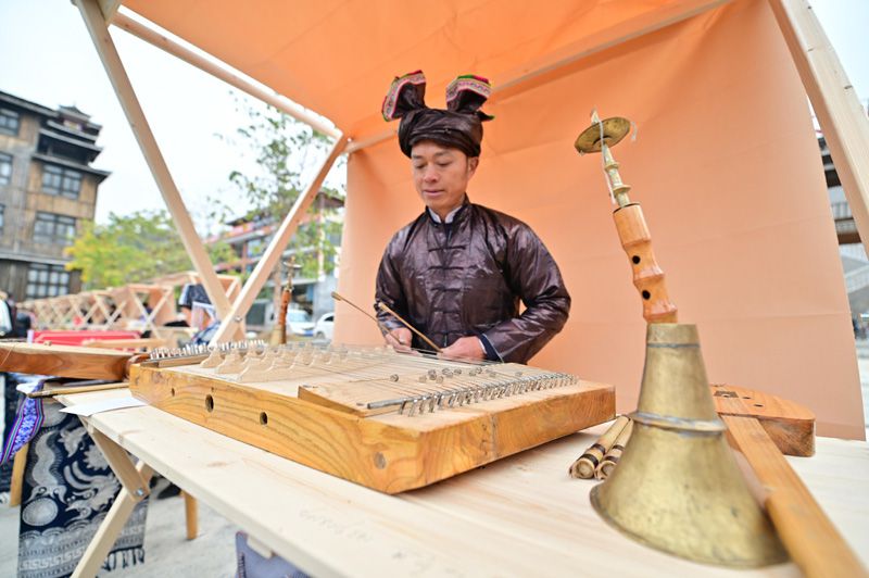 11月29日,侗琴制作藝人在貴州省從江縣周末非遺扶貧集市上展示侗琴演奏。新華社發(fā)(吳德軍 攝)