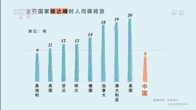 數(shù)據(jù)梳理發(fā)現(xiàn),西方主要國家碳達(dá)峰時,人均碳排放水平基本都在10噸以上,像美國、加拿大甚至在18噸以上。而根據(jù)清華大學(xué)相關(guān)研究的預(yù)測,到2030年,中國僅為8噸的水平。這說明我們將用更低的人均碳排放水平實現(xiàn)“碳達(dá)峰”。
