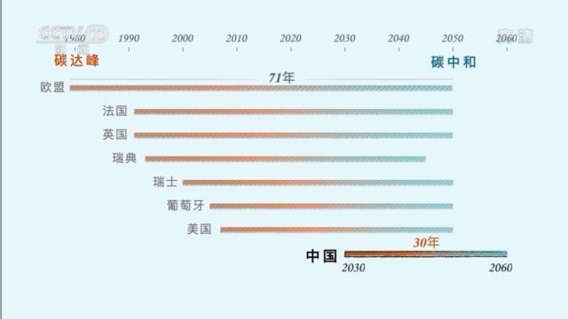 第三張圖,指的是中國從“碳達(dá)峰”到“碳中和”所要經(jīng)歷的時間跨度。大部分發(fā)達(dá)國家都有50-70年的過渡期,中國卻爭取只用30年時間,就要更加努力。