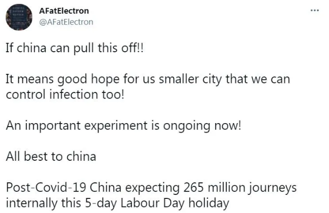 網(wǎng)友AFatElectron說:“如果中國能做到!這說明我們小城市控制疫情也有希望!”