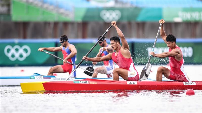 8月2日,中國選手劉浩(左)、鄭鵬飛在男子1000米雙人劃艇四分之一決賽中。新華社記者 潘昱龍 攝