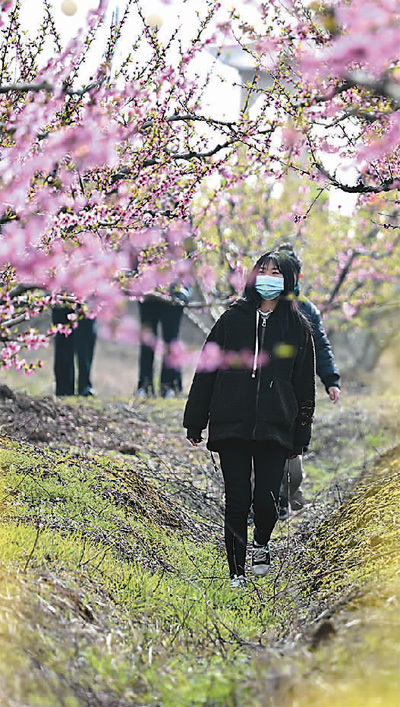 安徽省肥東縣響導(dǎo)鄉(xiāng)將桃產(chǎn)業(yè)與旅游產(chǎn)業(yè)相融合,以花為媒帶動(dòng)鄉(xiāng)村民宿、農(nóng)家樂(lè)等產(chǎn)業(yè)發(fā)展,助力鄉(xiāng)村振興。圖為游客在響導(dǎo)鄉(xiāng)的桃園內(nèi)游玩。 |