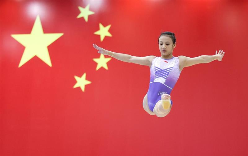??5月8日,中國體操隊隊員邱祺緣在訓練中。新華社記者 曹燦 攝