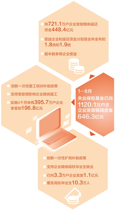 “返”,將中小微企業(yè)的失業(yè)保險(xiǎn)穩(wěn)崗返還比例由60%最高提至90%,大企業(yè)由30%提至50%。1至8月,各地向721.1萬(wàn)戶企業(yè)發(fā)放穩(wěn)崗返還資金448.4億元,受益企業(yè)和返還資金分別是去年全年的1.8倍和1.9倍,超半數(shù)參保企業(yè)受益。