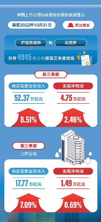 上市公司運行情況是觀察中國經(jīng)濟(jì)的窗口之一。中國上市公司協(xié)會近日發(fā)布的最新數(shù)據(jù)顯示,截至2022年10月31日,滬深交易所和北交所共有4945家公司披露三季度報告,前三季度共實現(xiàn)營業(yè)總收入52.37萬億元,占GDP總額的60.18%,同比增長8.51%;實現(xiàn)凈利潤4.75萬億元,同比增長2.46%??傮w來看,盡管面臨多重壓力,但上市公司前三季度依然交出了一份來之不易的成績單。