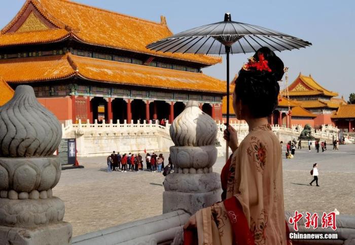 資料圖:11月6日,游客穿著各式古裝在北京故宮游覽。今年是紫禁城建成600周年,越來越多的游客熱衷于著古裝游覽。 中新社記者張宇 攝