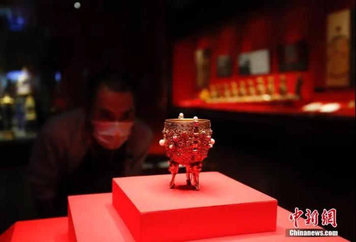 圖為游客參觀金嵌珠石金甌永固杯。中新社記者 杜洋 攝