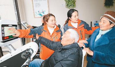 2020年12月8日,在重慶一家“智慧養(yǎng)老”服務(wù)站內(nèi),服務(wù)人員為老人指導(dǎo)智能健身器材的使用技巧。