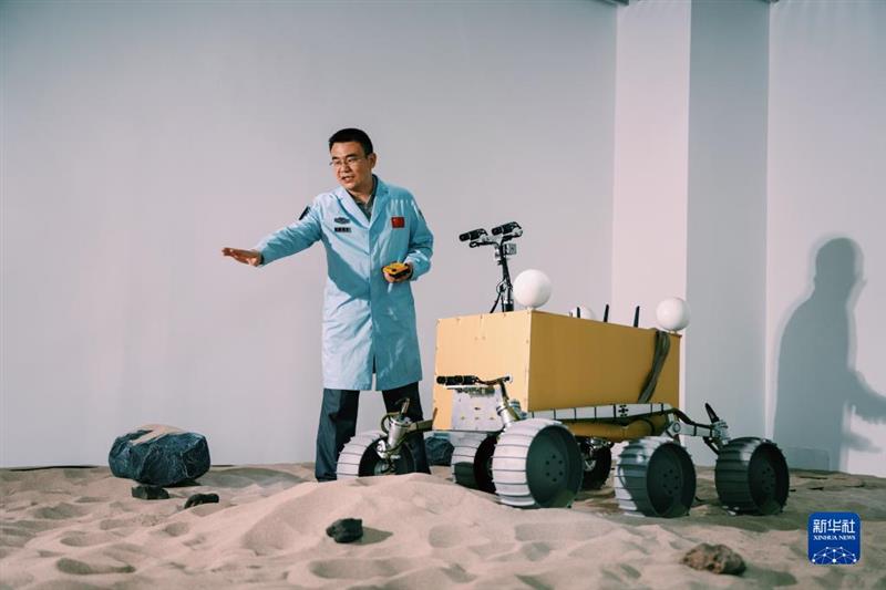 劉傳凱在北京航天飛行控制中心火星車模擬試驗場地講解任務(wù)情況(2022年6月30日攝)。新華社發(fā)(謝集瀟 攝)