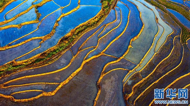 夕陽(yáng)下的梯田,如多彩緞帶。新華網(wǎng)發(fā) 歐陽(yáng)小明 攝