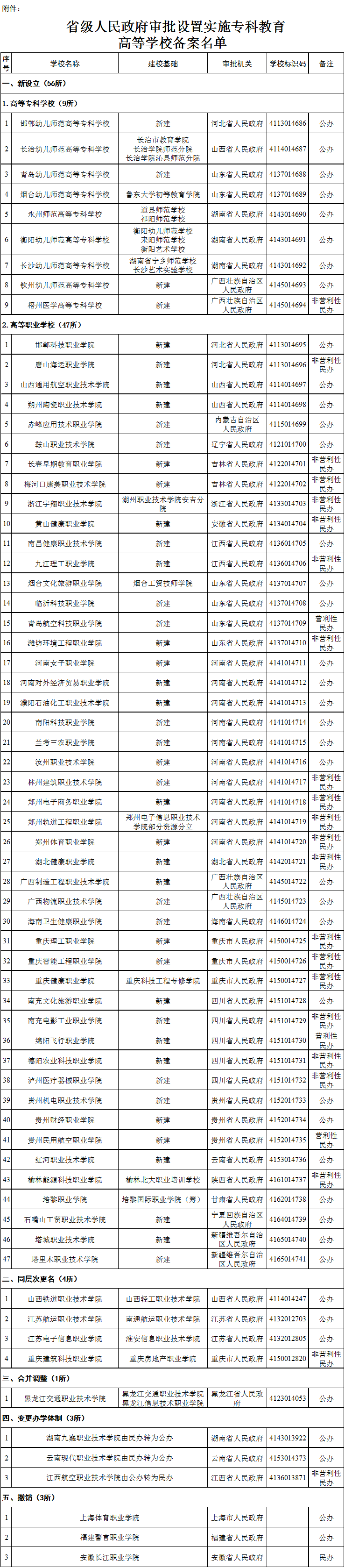 人民網(wǎng)北京5月22日電(馮粒)據(jù)教育部官網(wǎng)消息,根據(jù)《中華人民共和國(guó)高等教育法》《普通高等學(xué)校設(shè)置暫行條例》等有關(guān)法律法規(guī)的規(guī)定,教育部辦公廳公布本年度省級(jí)人民政府審批新設(shè)、更名、合并調(diào)整、變更辦學(xué)體制、撤銷的??茖哟胃叩葘W(xué)校備案名單。