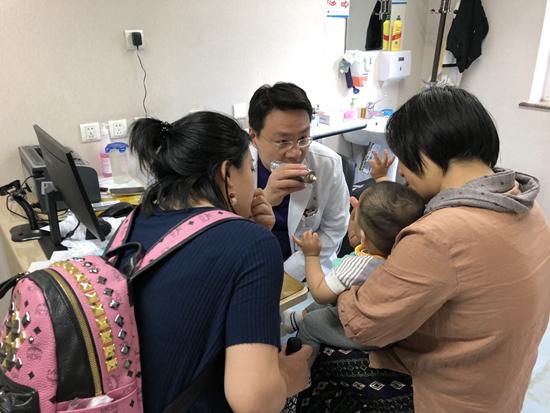 眼科專(zhuān)家認(rèn)為,0-3歲兒童的視力篩查不該被忽視,這也是近視防控關(guān)口前移的重要方面。2018年6月,北京大學(xué)第一附屬醫(yī)院小兒眼科副主任醫(yī)師肇龍?jiān)跒橐幻變簷z查眼睛。劉昶榮/攝