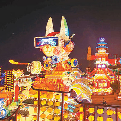 走進城墻永寧門,首先迎接游人的便是高約18米的“月中桂兔”燈組:一只玉兔挺起身子,把桂樹輕嗅,憨態(tài)可掬,惹人憐愛。