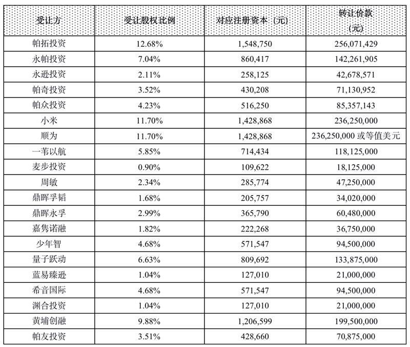 3月23日,跨境通發(fā)布公告稱,擬將其持有的全資子公司帕拓遜100%股權(quán)以20.20億元轉(zhuǎn)讓至小米、順為、鼎暉、量子躍動等20家受讓方。
