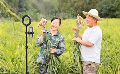 在甘肅省隴南市徽縣永寧鎮(zhèn)唐莊村唐壩社,“鄉(xiāng)村網(wǎng)紅”王珍梅利用電商直播平臺(tái)銷售優(yōu)質(zhì)農(nóng)產(chǎn)品,助力當(dāng)?shù)靥厣a(chǎn)業(yè)發(fā)展。圖為王珍梅(左)與生姜種植戶正在直播推介生姜。李旭春攝(人民圖片)