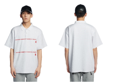 印花短袖POLO衫以獨(dú)特標(biāo)語(yǔ)「Our pack consists of individual creatures」的重復(fù)疊加,在無(wú)限循環(huán)中呼應(yīng)「二進(jìn)制」系統(tǒng)下的遞進(jìn)與重生。