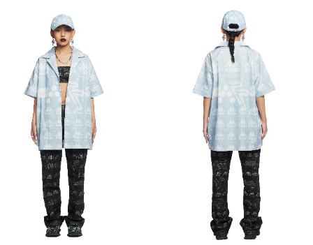 圖形字母印花襯衣則將Omini 字母印花拉近放大,打造出反常規(guī)的視覺(jué)效果;襯衫上下以矩陣式排列的品牌Logo與之對(duì)比,形成強(qiáng)烈反差。