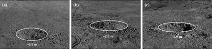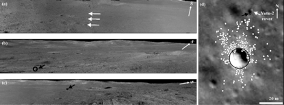 已有研究結(jié)果顯示,位于著陸區(qū)西北方向的織女撞擊坑的一條濺射紋恰好穿過了著陸點(diǎn)附近區(qū)域,而濺射紋內(nèi)常??梢娪蔀R射物形成的二次撞擊坑?!坝裢枚枴毖惨晠^(qū)確實(shí)還能觀察到若干個(gè)內(nèi)部和周邊均存在碎塊狀物質(zhì)的米級和亞米級的新鮮撞擊坑(如下圖所示)。結(jié)合橢圓撞擊坑的長軸方向推斷,這些新鮮撞擊坑應(yīng)當(dāng)為織女撞擊坑濺射物形成的二次撞擊坑。